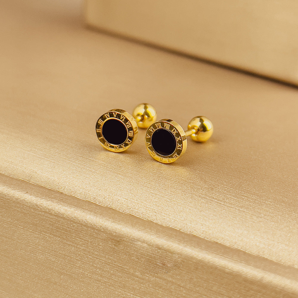Make a timeless statement with our Gold Plated Roman Numeral Stud Earrings. Featuring a sleek black center surrounded by Roman numeral detailing, these earrings blend classic style with modern sophistication.