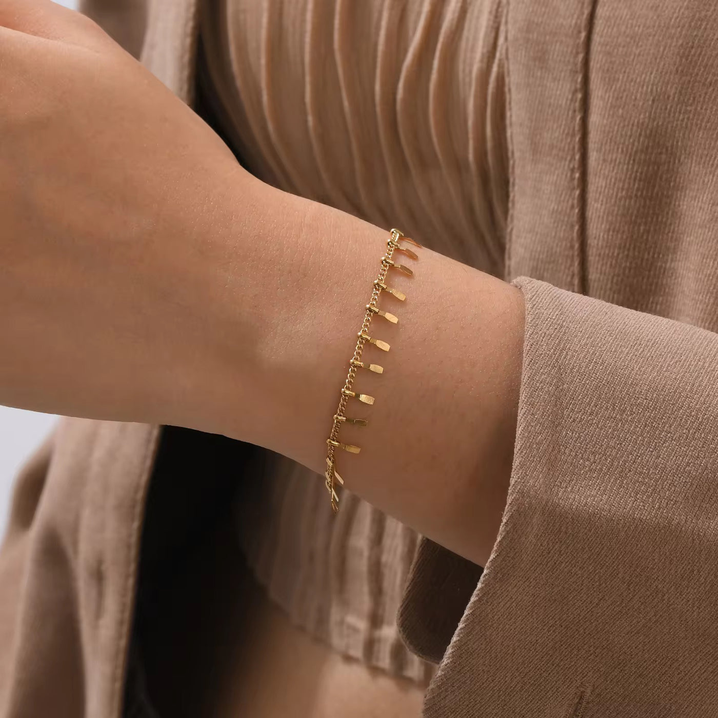 Add effortless shimmer to your wrist with our 18K Gold Plated Mini Bar Fringe Bracelet (Adjustable). Dainty rectangle charms dance along a sleek curb chain, catching the light with every move for a chic, minimalist finish.