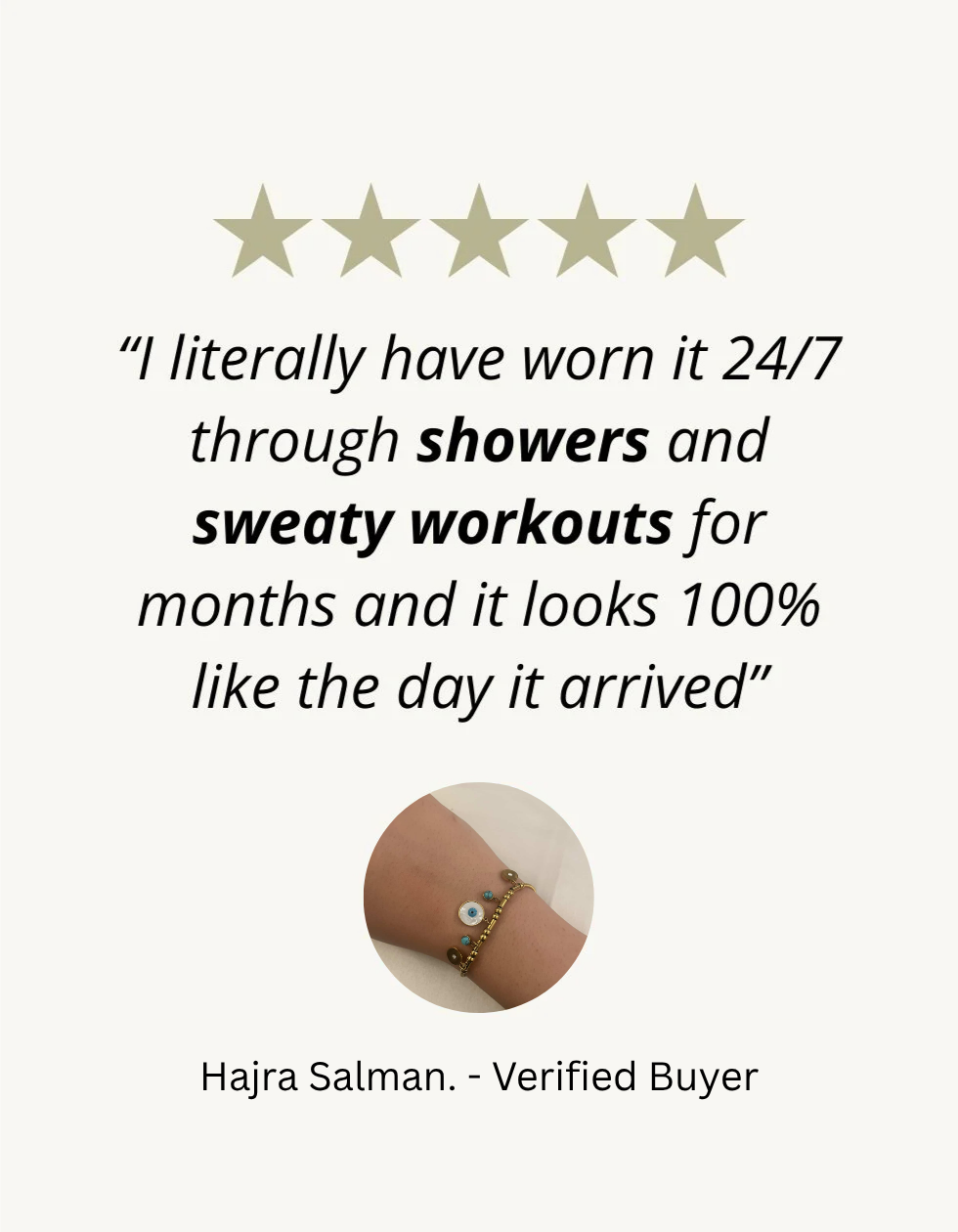 Our jewelry is 100% waterproof and sweatproof, designed to stay vibrant through your daily adventures! Wear it confidently in the shower, pool, gym, or ocean – it resists tarnishing under everyday conditions. ✨