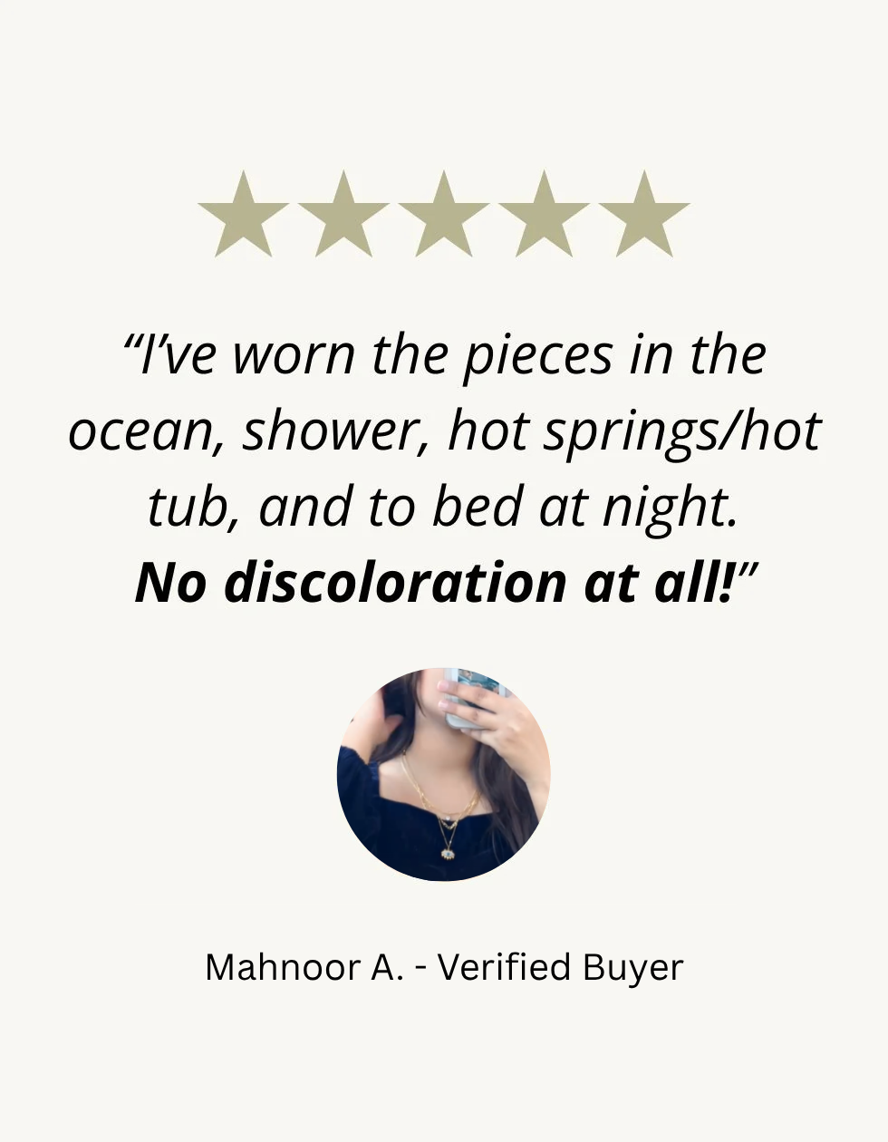 We stand behind our color durability and offer a 1-year warranty against any gold or silver color loss. If your piece shows unexpected tarnishing within the first year, we'll replace it immediately – no questions asked.