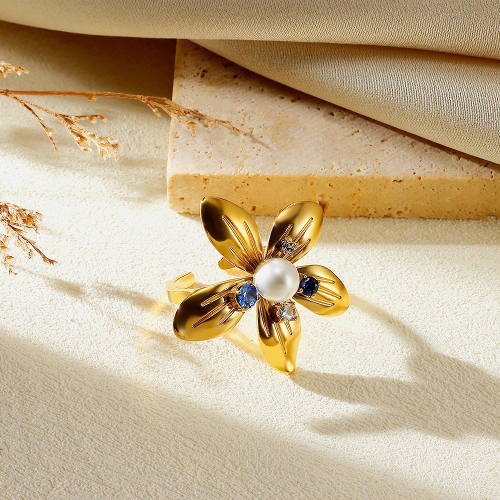 18k Gold Plated Flower Ring with Pearl & Cubic Zircon - Gold