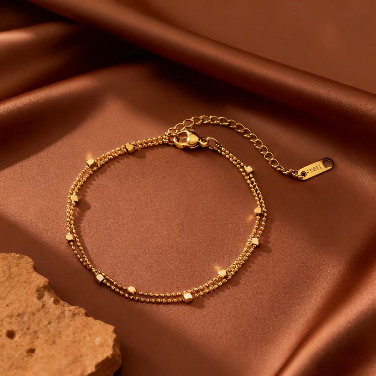 Enhance your style with our Gold Plated Double-Layer Beaded Anklet. Featuring two delicate beaded chains adorned with heart-shaped charms, this anklet offers a charming and modern twist on classic elegance.