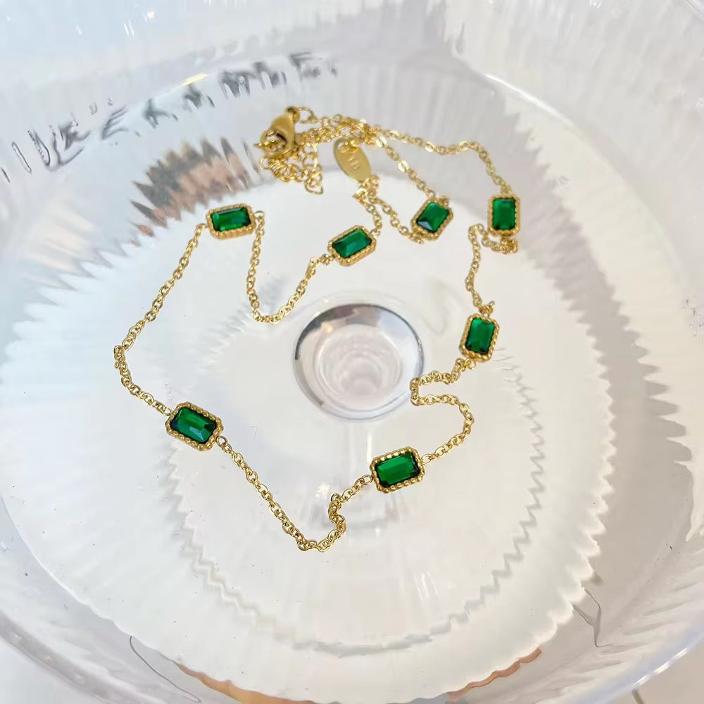 Green Crystal-Studded Thin Chained Necklace - Gold